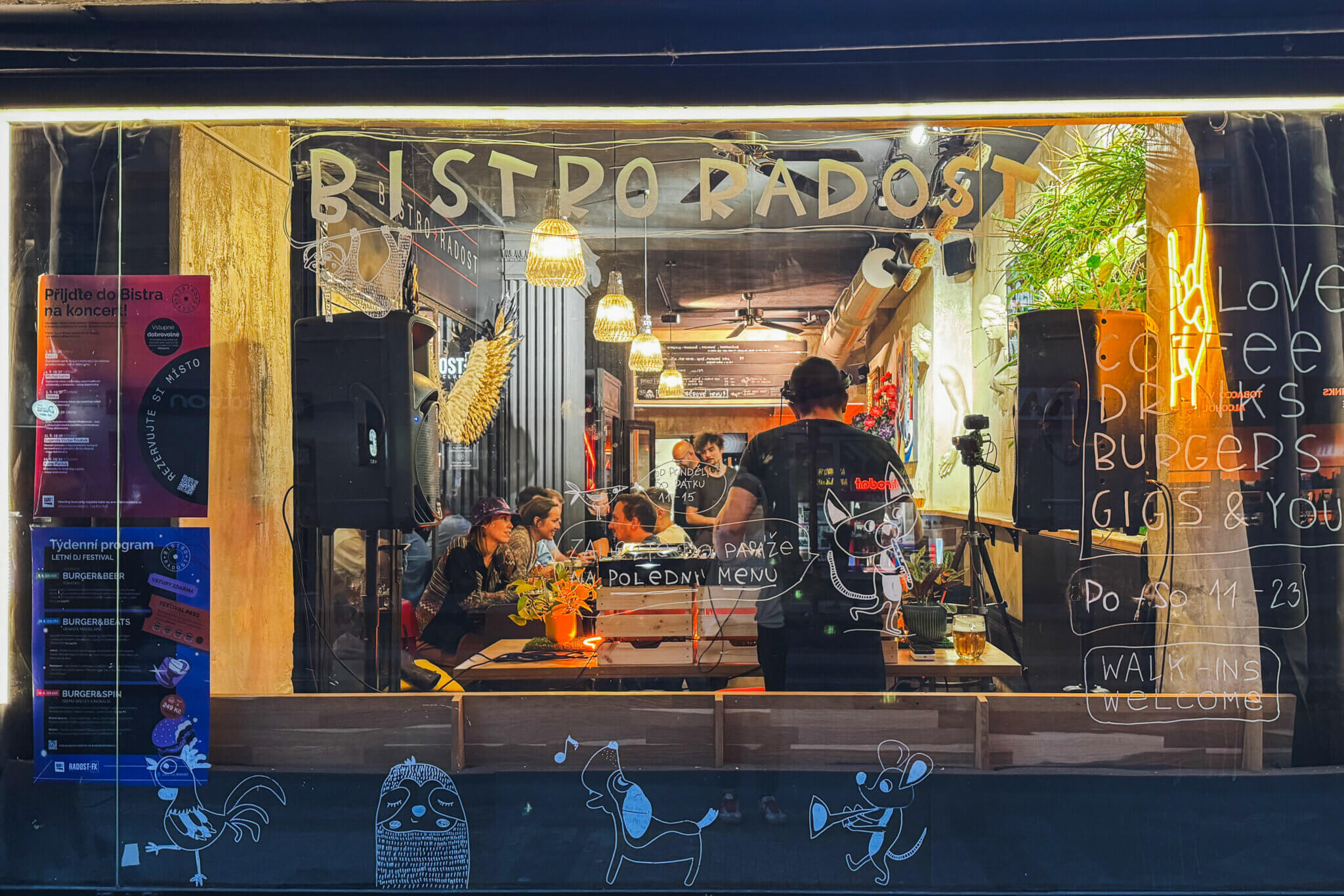 Každý čtvrtek, pátek a sobotu hrají ve výloze Bistra Radost DJs.