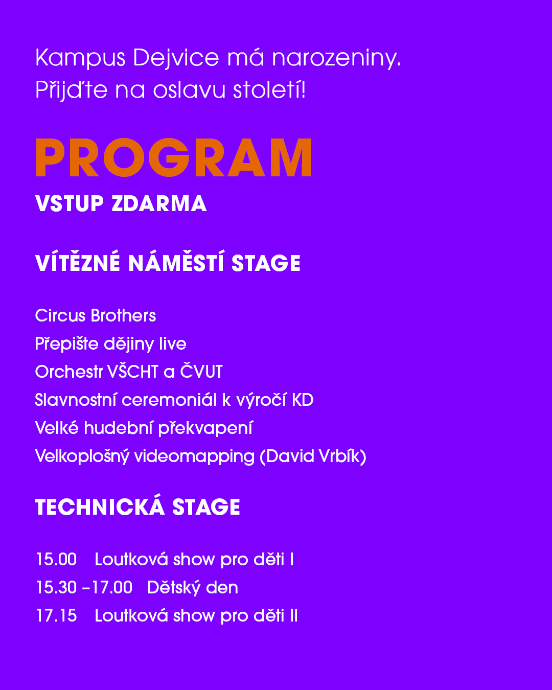 Kampus Dejvice slaví významné jubileum – 100 let od svého vzniku. Při této příležitosti se chystá velkolepá oslava, která proběhne ve středu 11. června přímo v srdci kampusu, na Vítězném náměstí.