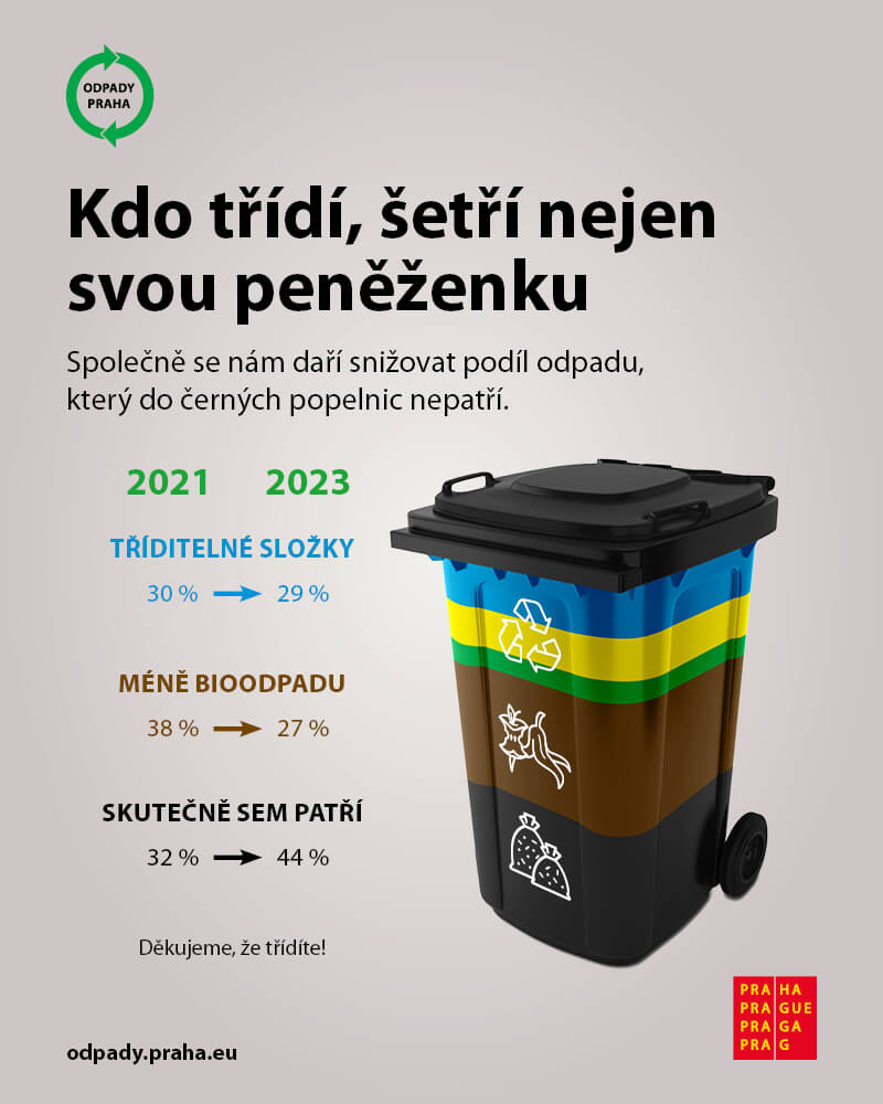 Odborníci se shodují, že Pražané třídí čím dál důsledněji. Šetří přitom životní prostředí i vlastní peněženky. Přesto některé rozbory naznačují, že více než polovina obsahu nádob na směs patří do barevných kontejnerů. „Není divu, že jsou ty černé často přeplněné,“ vysvětluje Komarnický a dodává: „Skvělým příkladem je bioodpad. Když ho vytřídíte, sníží vám náklady na svoz. Speciální popelnici si lze zdarma objednat například přes web Pražských služeb.“