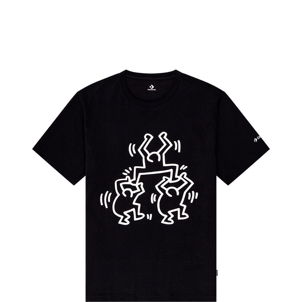 Pod Haringovo rukama prošla i Converse trička v černé a bílé barvě. Pevný model 250gsm je nepřehlédnutelný i při pohledu zezadu. Právě na zádech je zobrazena nástěnná malba ve žluté barvě s ikonickou siluetou tanečníka, která se stala Haringovo poznávacím znamením. Milovníci streetstylu ocení, že součástí limitky je i populární bucket hat.