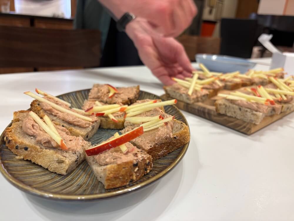 Mezi brown foods by se jistě dala zařadit i vlastně triviální dobrota vhodná jako předkrm (nebo doma k večeři?) – hodně másla a trochu drůbežích jater, v podstatě máslovější sestřenice paštiky. Na pohled neurčitá hmota, na chlebu vzhledově taky nic moc (i když s rovnoměrnými kousky sladkokyselého jablka vypadá lépe), chuťově skvost, tohle budu připravovat návštěvám.