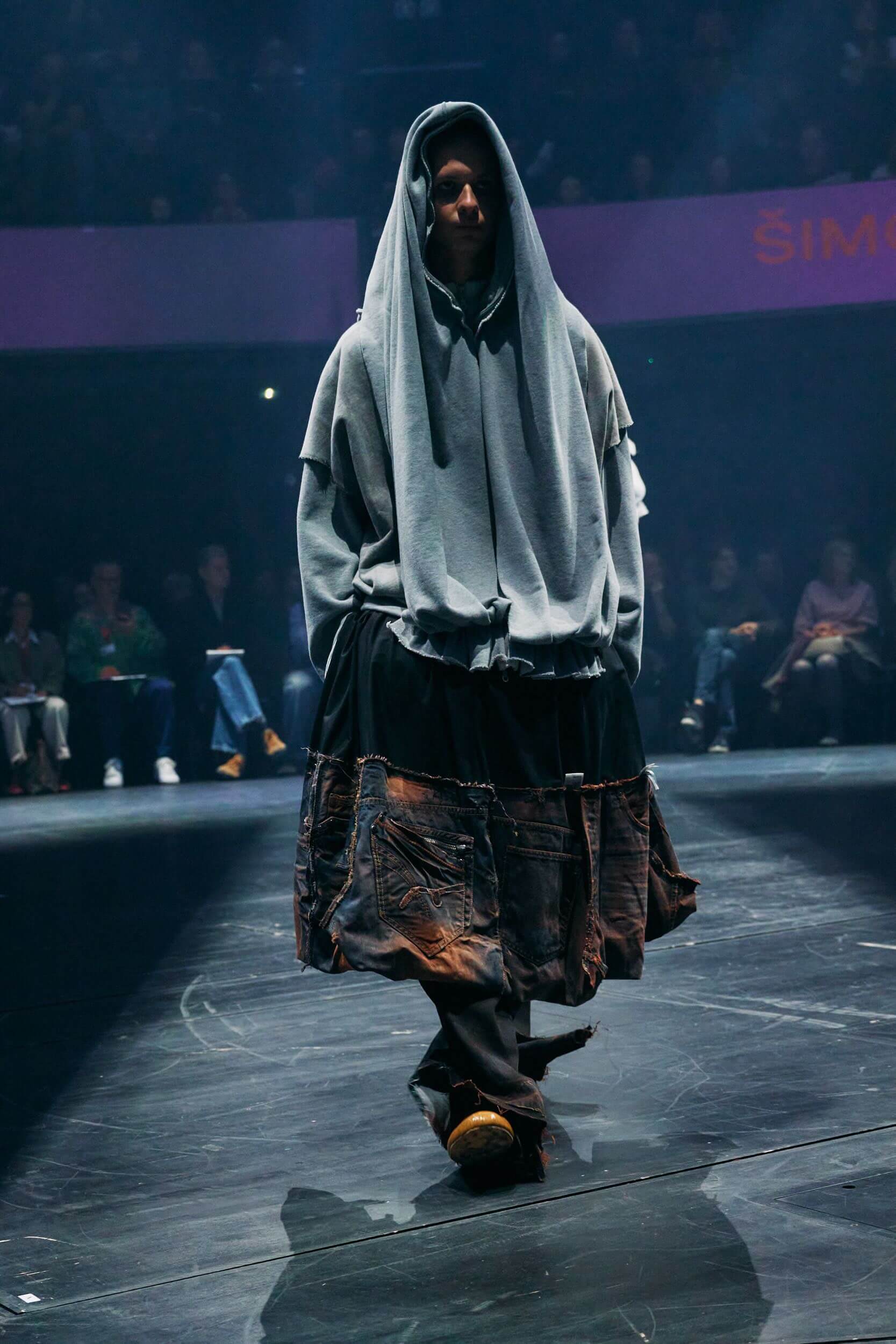 Třetí blok byl ve jménu upcyklace, DIY přístupu k oděvu a důrazu na jeho matérii. Oděv jako socha, jako nositelný objekt? Tak k němu přistoupili Lieu Le i Šimon Žák, kteří řemeslně “skulptovali” z deadstock materiálů. Skrze estetiku amerického fotbalu, vojenského a obnošeného oděvu zkoumala ženství Sara de Vroe a Kim Gemmink nastavila kritické zrcadlo systémové rigidnosti, kde jediným pravidlem je výzva ke hře.