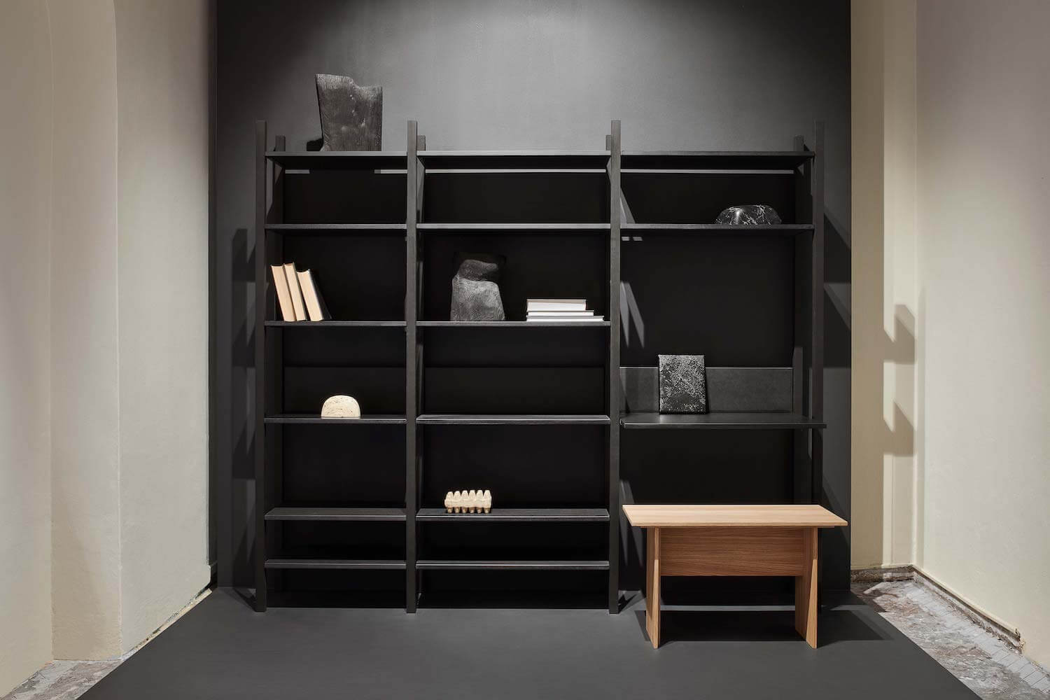 Tmavá varianta je originálním řešením pro ty, co se v interiéru nebojí experimentovat. Na obarvení nosných hranolů jsme použili v nábytkářství málo používanou japonskou techniku Shou-sugi-ban. Jedná se o tradiční úpravu dřeva opalováním, díky níž jsme dosáhli maximální odolnosti a barevné stálosti materiálu. Hranoly tak získaly specificky matně černý odstín, který je zafixovaný šetrnou povrchovou úpravou. Vnitřní prvky tvoří probarvené desky vysoké tvrdosti v černé barvě doplněny černými ocelovými spojkami.