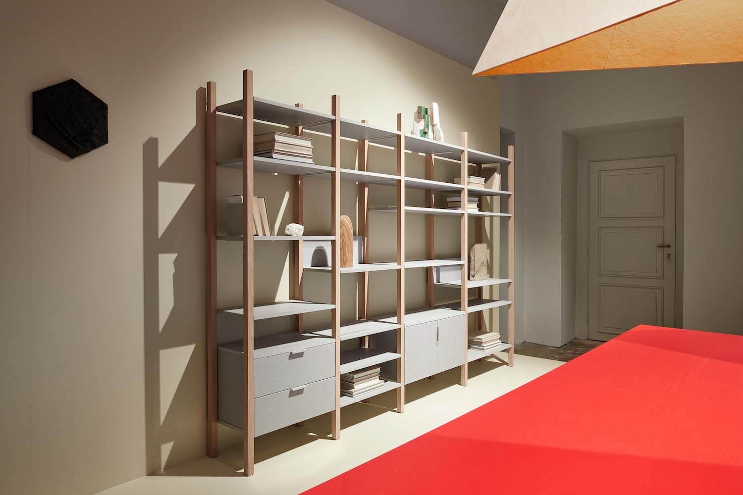 Světlá varianta přírodního charakteru, která decentně doplní každý interiér a nechá vyniknout všemu, co do ní vystavíte. Nosné hranoly z tvrdého bukového dřeva jsou doplněny horizontálními prvky z tvrdého deskového materiálu v šedé barvě. Ve stejné barvě jsou i ocelové kotvící prvky.