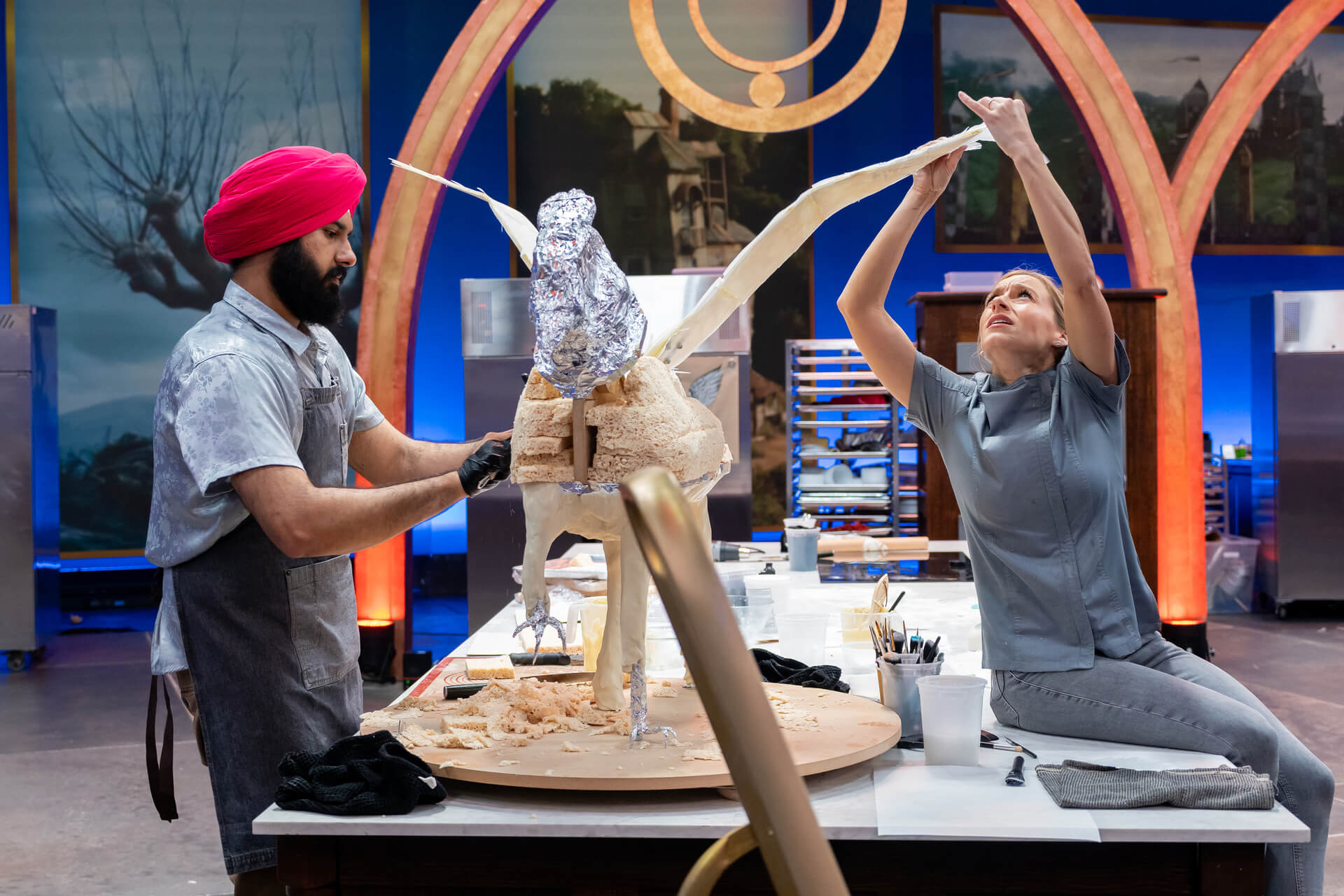 Contestants Jujhar Mann and Katie Bonzer, as seen on Harry Potter: Wizards of Baking, Season 2.