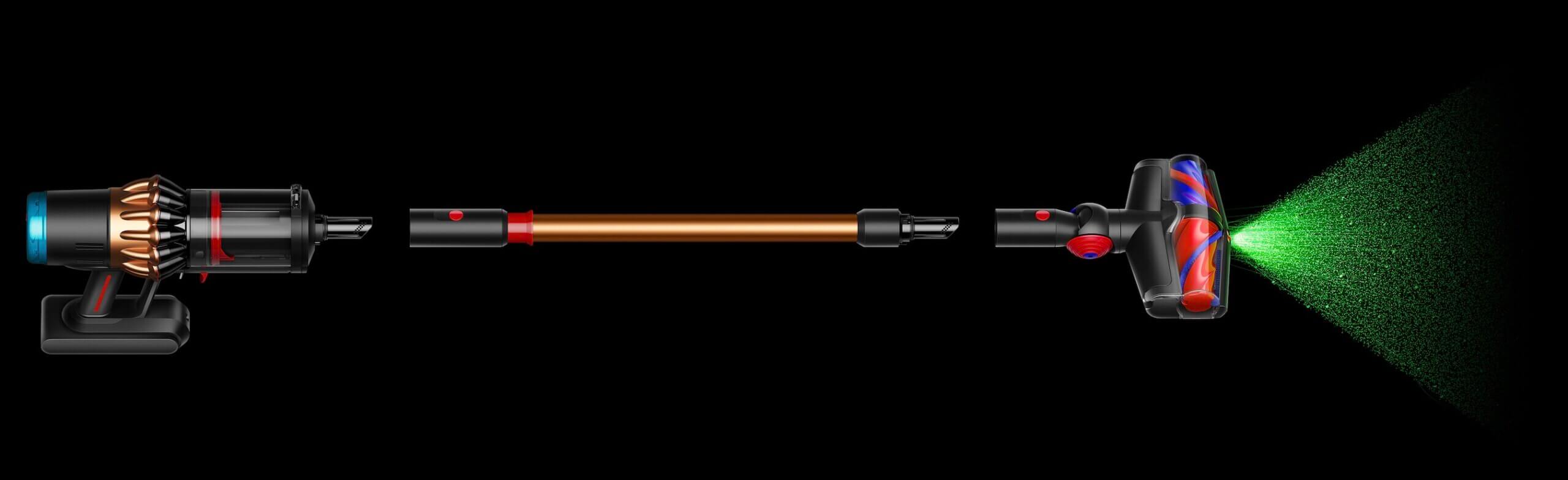 Přístroj si zachovává všechny přednosti unikátních vysavačů Dyson: Vysoce výkonné sání, dvojité zelené světlo podobné laseru i připojení k aplikacím – to vše však naleznete v ultratenkém provedení. Nový lineární systém odděluje prach od proudu vzduchu a stlačuje jej tak, aby nádoba pojala pětkrát více nečistot, než je její kapacita 0,08 l. Hygienický systém vyprazdňování zásobníku na prach umožňuje vysypávat nečistoty do koše a zároveň stejným pohybem otírat kryt.
