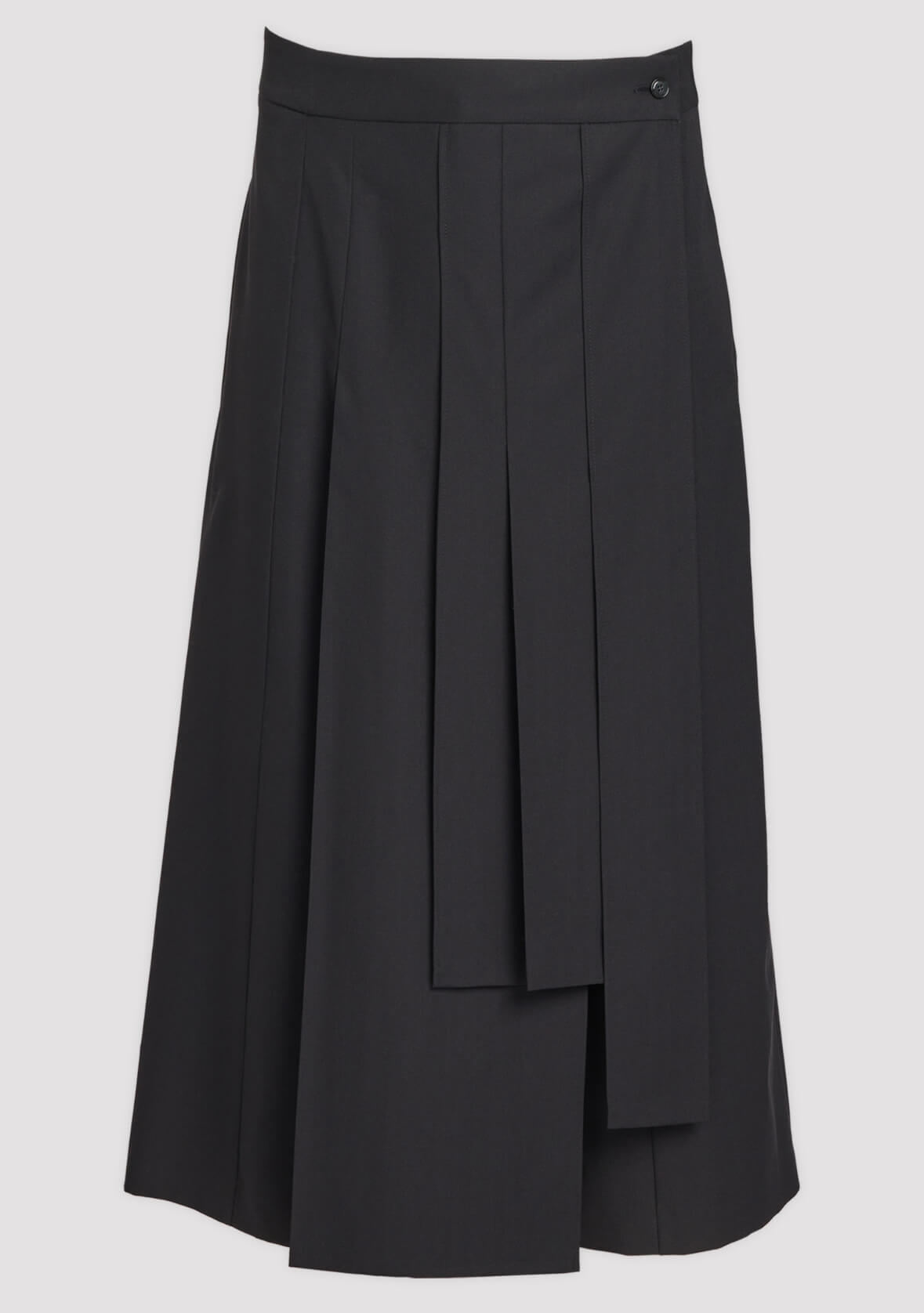 Rebelský kousek, který vzdává poctu odvážnému a nebojácnému stylu. Na první pohled minimalistická součást šatníku skrývá mnoho detailů vyprávějící hned několik příběhů. Přední skládaná část evokuje skotské sukně, po odepnutí však odhalí klasicky střižené kalhoty. Zadní kapsy a puky odkazují na formální střih, přední sukně současně buduje osobitý styling.