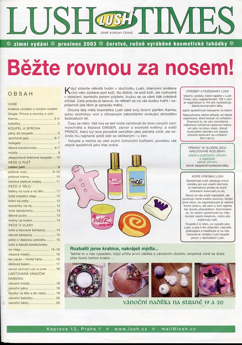 A: Jako středoškolačka jsem se tenkrát byla projít ve Vojanových sadech a u východu jsem narazila na obchůdek Lush, který na tom místě tenkrát krátce byl. To může být už nějakých 17 let! Všechno na té malé prodejně mě úplně pohltilo, byla tam úžasná obsluha, která mi s nadšením vyložila vše o filozofii značky a produktech. Na doma jsem dostala Lush Times, ze kterých jsem byla úplně paf, jak chytře a vtipně byly napsané. Do pár dní jsem je uměla nazpaměť. V té době to byl opravdu unikátní a nečekaný retail a marketingový zážitek, působící jako svěží vítr. Když jsem pak hledala brigádu, volba byla jasná.