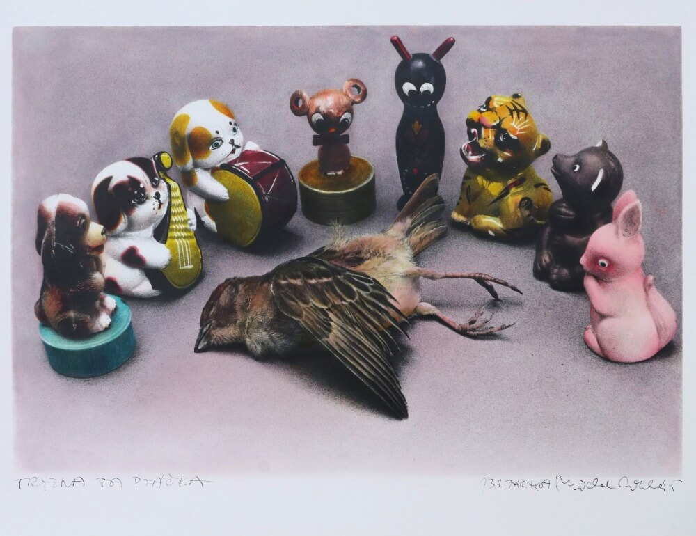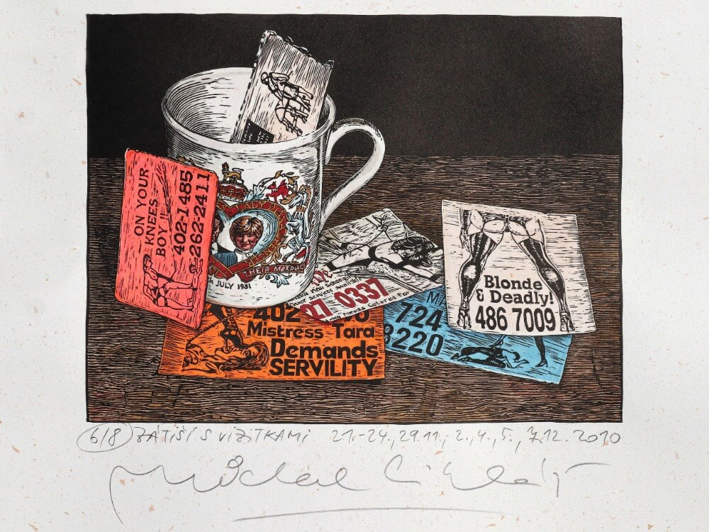 Teď pracuju spíš na sobě, abych se trochu zregeneroval a odpočinul si po víc než půlroční přípravě a pak následné instalaci mé veliké výstavy v Masných krámech Západočeské galerie v Plzni. Jde o prostornou bývalou tržnici, takže v součtu mají všechny její stěny do délky přes 220 metrů. A já trpím fóbií z prázdnoty, takže jsem musel celý prostor galerie pořádně zaplnit, abych mohl být s expozicí spokojenej. Vystavuji tam svoje práce za posledních čtyřicet let, převážně linoryty s námětem zátiší, což je moje veliké a letité téma. Ale najdete tam i trochu koláží, kreseb, všelijaké doličné předměty k zátiším a taky různé fotografie, některé jsou i kolorované. Hlavně mám radost z kolekce 66 nearanžovaných fotek autentických „zátiší“ erotických pomůcek, které jsem při cestách do zahraničí tajně pořizoval v sexshopech různých metropolí. Na této výstavě se vlastně všechno točí kolem tématu zátiší, včetně názvu celé výstavy: Zátiší s hozenou rukavicí. K této příležitosti mi vydal KANT v úpravě Roberta V. Nováka i stejnojmennou knihu. V jejím úvodu vedu nejen o zátiších rozhovor s Pavlem Kosatíkem, závěrečný text mi napsal Marcel Fišer. Takže moje nové věci se dají vidět nejen v téhle monotematické monografii, která mi dělá radost, ale hlavně naživo a až do konce srpna na té plzeňské výstavě. Prezentuji tam dvě stovky mých prací na papíře, včetně dvou linorytů z letošního ledna…