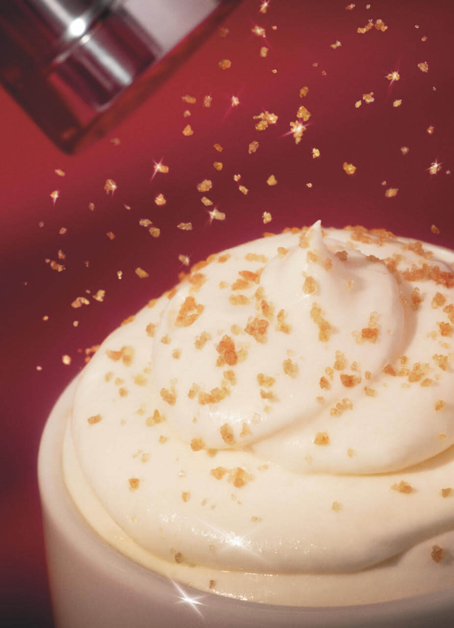Bohatý Espresso Roast se snoubí s karamelovým sirupem a napěněným mlékem. Nápoj je doplněn šlehačkou a posypán karamelizovanými oříšky – pro dokonalou kombinaci sladké chuti a vůně sváteční pohody. Vychutnat si ho můžete i ve 100 % veganské verzi.