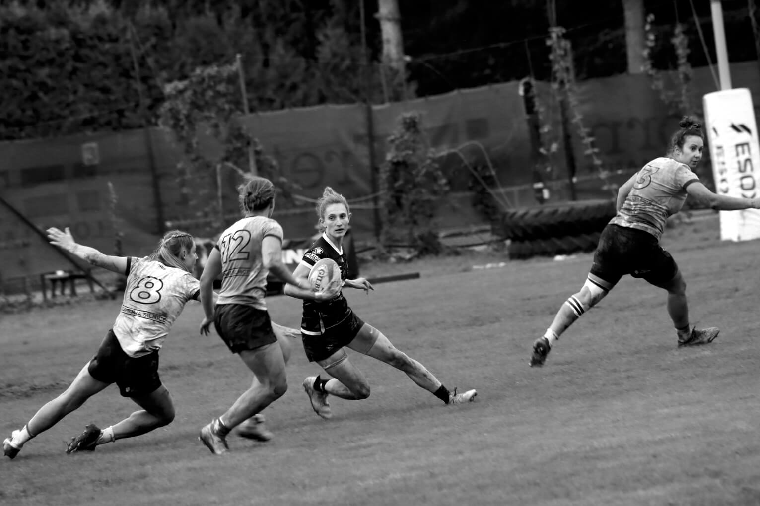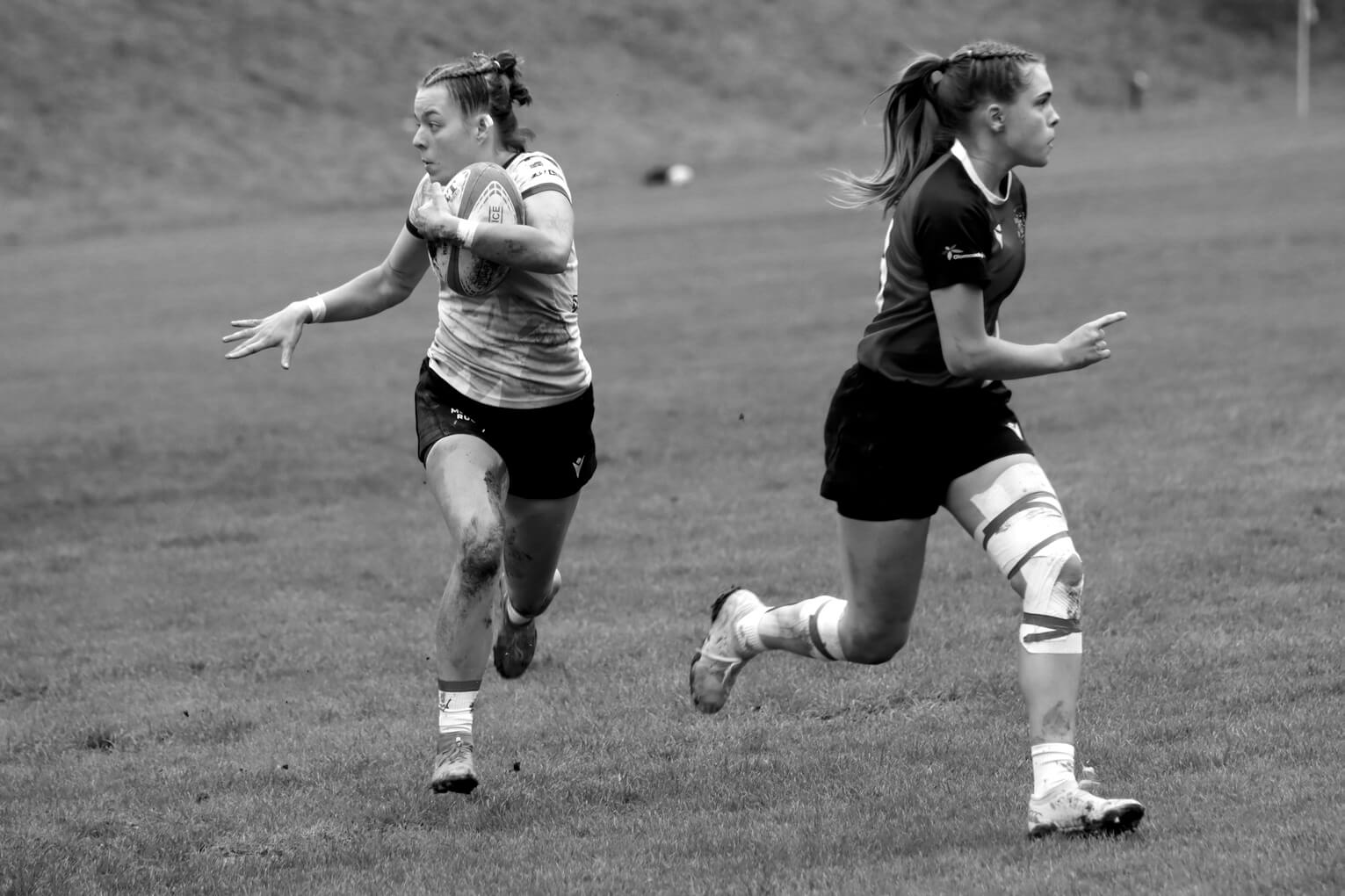 Kristína Yassu Riegertová (Tatra Smíchov) probíhá obranou Moravia Rugby.