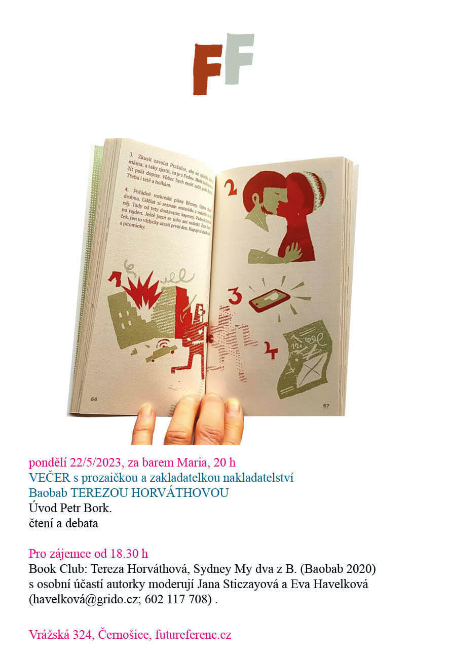 Spisovatelka, zakladatelka nakladatelství Baobab a rytířka nejvyšších stromů Tereza Horváthová zavítá v pondělí 22. května do klubu Ferenc Futurista v Černošicích.