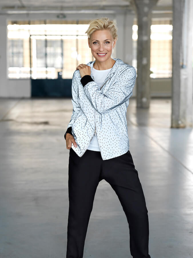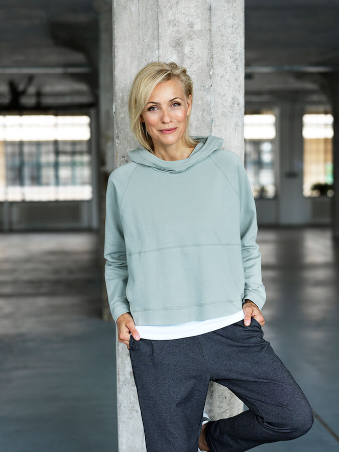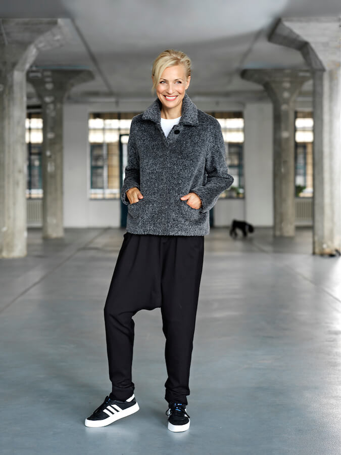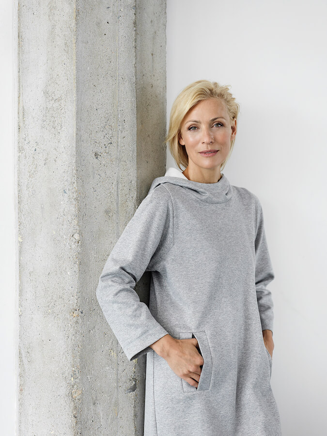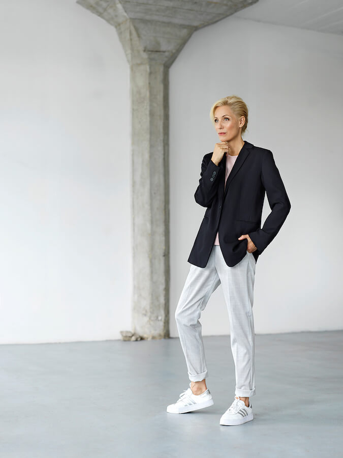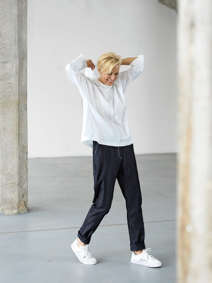 „Kolekce má dvě linie,“ řekla nám Ivana Šafránková. „Jedna je pohodlná, z kvalitních úpletů: mikiny, úpletové kalhoty – tepláčky nebo sarouelky, šaty, sukně a samozřejmě trika, nejen v nové proporci boxy.“ K téhle části kolekce, kterou často zdobí roztomilé kapuce, se skvěle hodí tenisky.