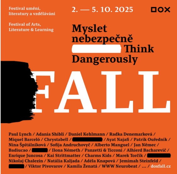 „Pro letošní rok jsme zvolili téma, které považujeme za znepokojivě aktuální. Vycházíme z úvahy, že svět umění a literatury ještě ani nestihl zareagovat na tlaky tzv. cancel culture (kultury rušení) či woke culture (uvědomělé kultury) posledních let, a už se v některých, donedávna ještě liberálních zemích stává předmětem jiné cenzury: takové, která nebezpečně připomíná dobu minulých autoritářských režimů. Že svou roli nově samozřejmě sehrávají i technologie včetně umělé inteligence. Že počet ‚nepohodlných‘ knih v mnoha zemích narůstá a umělecké instituce se ocitají pod tlakem. A tak nás bude zajímat, jak na tyto tlaky reagují umělci, spisovatelé a jestli se do jejich tvorby dostává autocenzura. O otázkách umělecké svobody v dnešním světě budeme mluvit s tvůrci z řady zemí včetně Ukrajiny, Irska, Slovenska, Běloruska, Německa, Číny, Íránu nebo Palestiny. Záměrně nejednoznačné motto MYSLET NEBEZPEČNĚ jsme si vypůjčili ze slavného proslovu Alberta Camuse ‚Umělec a jeho doba‘ z roku 1957, který v rámci festivalu vydá DOX poprvé v českém překladu Denise Molčanova. S hosty festivalu se budeme mimo jiné bavit o tom, co znamená myslet nebezpečně ve 20. letech 21. století,“ říká Michaela Šilpochová, umělecká ředitelka Centra současného umění DOX a zakladatelka a hlavní kurátorka festivalu FALL.