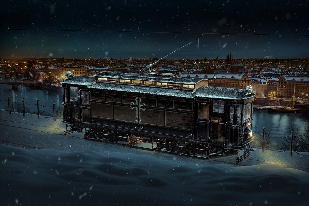Pražská pohřební tramvaj, která vozila v letech 1917–1919 z pražských vojenských nemocnic zesnulé vojáky na hřbitovy, v současné vizualizaci Adama Bartase.
