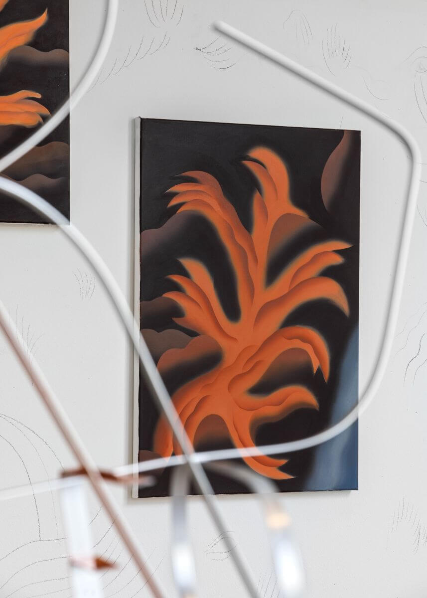 Návštěvníci se v Londýně mohou těšit na pestrý výběr děl, přičemž propojující linkou mezi jednotlivými díly se stal především motiv vody a termálních pramenů. Například Jakub Tytykalo se ve své sérii obrazů inspiroval představou podzemního zdroje tepla, který ohřívá karlovarské minerální prameny. Jeho výtvarný jazyk následně reflektovala Néphéli Barbas, která tento motiv přetvořila do instalace z hliníkových pásů. Příkladem úzké spolupráce mezi umělci je také dvojice Karíma Al-Mukhtarová a TEA. Zbytkový materiál z Karíminy tapiserie, odkazující k tématu koupele a lázeňské tradici města, využila TEA při tvorbě sochy s názvem Písař. Symbolicky tak do svého díla otiskla i práci své kolegyně.