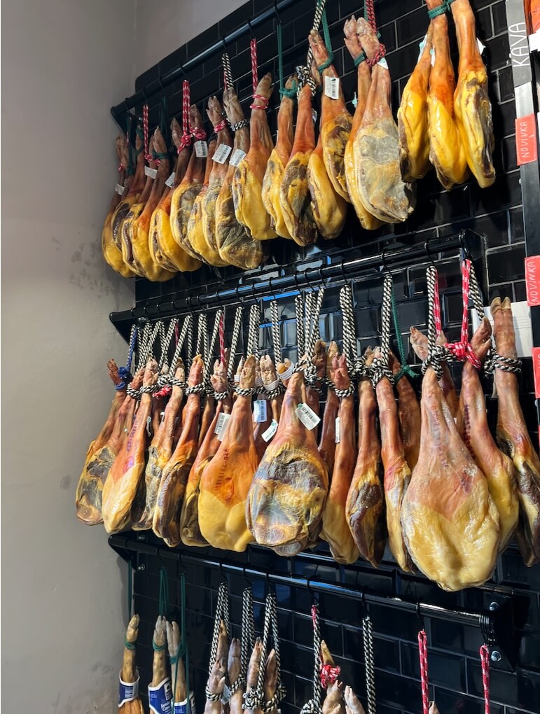 Je tu i pár stolečků, kde is nákup můžete promyslet u výběrové kávy, nebo se prostě posílit před cestou dál. Hodí se to i proto, že se sem hodně chodí na větší nákup před večírky nebo třeba pro významnější jedlé dary jako třeba celý jamón (šunka) a zažili jsme tu, že se rodina radí, co a jak.